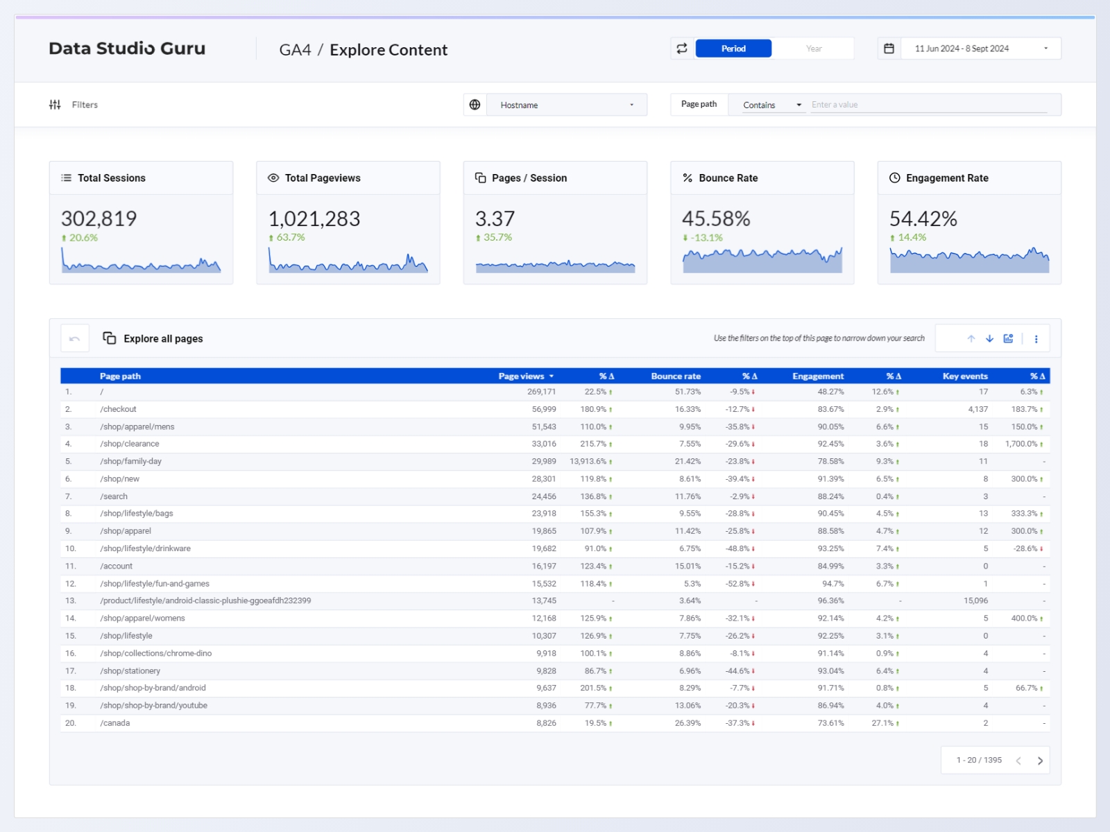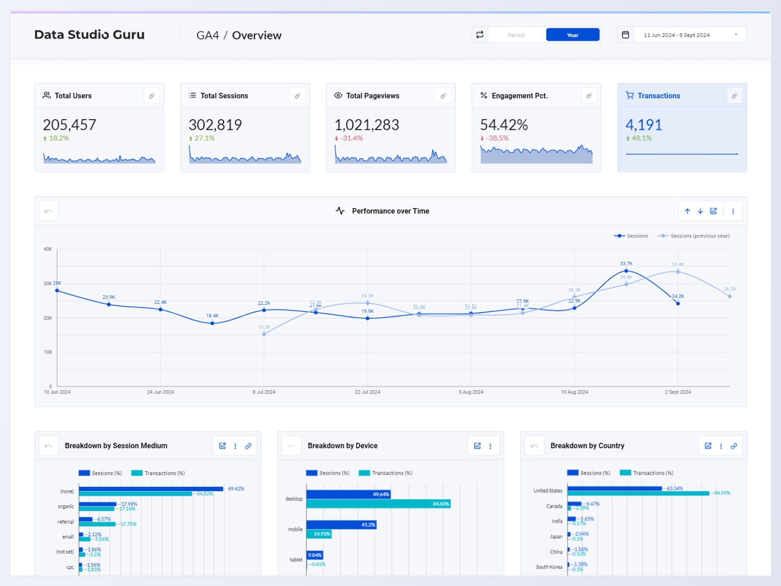 This Looker Studio template seamlessly connects to your Google Analytics 4 property, instantly providing insights into your website or application's analytics. The report allows you to dive deep into performance data while maintaining a user-friendly, lightweight design. With its sleek, usability-focused layout, you’ll impress your audience with a visually stunning and powerful report.
