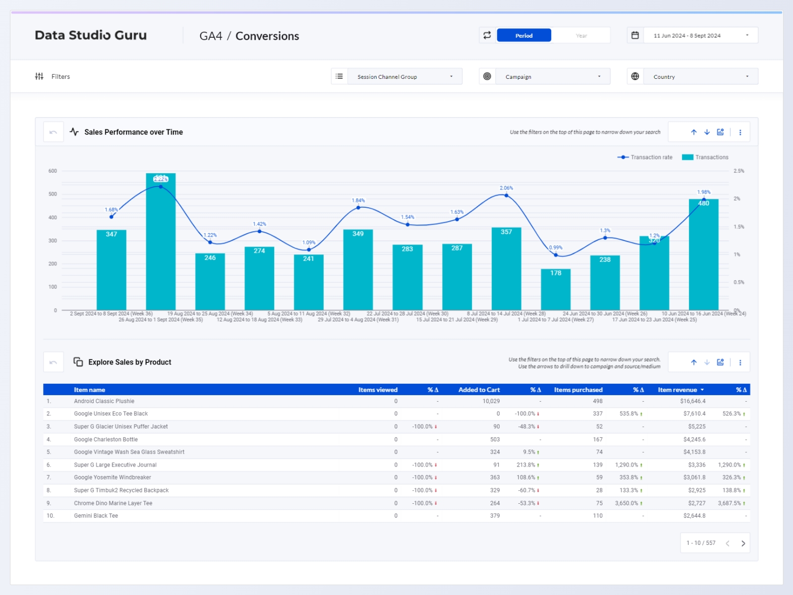The template is fully native to Looker Studio (with the exception of icons), making it quick and easy to customize visuals and graphs to meet your business needs. It's also effortless to align with your brand — just swap out the logo, change the gradient bar color in the header, and you're good to go. With options to filter, cross-filter, drill down, add optional metrics, compare data to the previous period or year, and export your results, everything you need is at your fingertips.